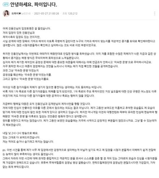 파이는 지난 27일 아프리카TV 개인 채널 게시판을 통해 글을 남겼다. 그는 “사실 관계에 대한 양측의 기억과 해석이 이토록 극명하게 갈린다면 누구의 기억과 해석이 맞는지를 객관적인 증거를 토대로 확인해야 한다”면서 “많은 시청자들께서 확인하고 싶어 하는 것도 바로 이런 부분”이라고 밝혔다.