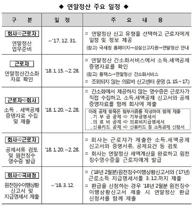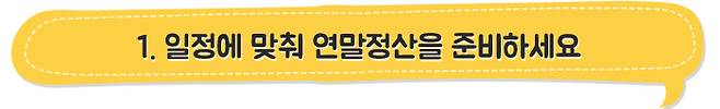 올해 근로소득이 발생한 근로자는 내년 2월분 급여를 지급받을 때까지 연말정산(일용근로자 제외)을 하여야 합니다. 근로자는 국세청의 안내 내용을 참고하여 소득·세액공제가 누락되지 않도록 연말정산 공제자료를 꼼꼼히 준비하고 회사는 소속 근로자들이 공제자료를 여유있게 준비할 수 있도록 연말정산 일정에 따라 진행하여 주시기 바랍니다.