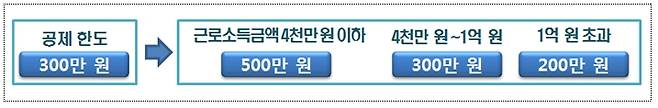 - 근로소득금액 4천만 원 이하자의 공제 한도를 300만 원에서 500만 원으로 확대하고, 근로소득금액 1억 원 초과자의 공제 한도를 300만 원에서 200만 원으로 축소함.