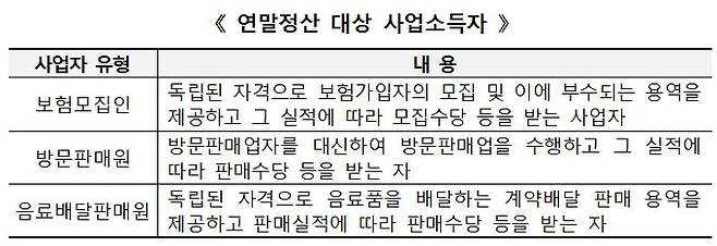 □ 간편장부대상자인 보험모집인 등의 사업자에게 사업소득을 지급하는 원천징수의무자는 해당 과세기간의 사업소득금액에 대하여 연말정산하여 소득세를 징수하여야 함.