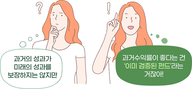 과거의 성과가 미래의 성과를 보장하지 않는다는 말을 수없이 들었어도, 과거수익률이 좋다는 것은 ‘이미 검증된 펀드’라고 생각할 수 있기 때문에 투자결정 시 1순위로 생각하게 되는 거죠.