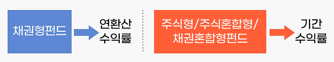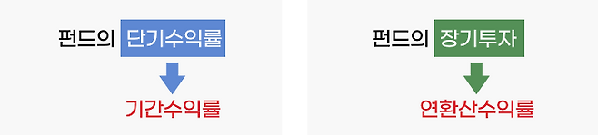 반면 수익률 변동성이 큰 주식형펀드/주식혼합형펀드/채권혼합형펀드는 주가변동에 따라 단기간 동안 펀드 수익률 변동폭이 커질 수 있어, 이를 연수익률로 환산할 경우 과다하게 수익률이 커 보이거나 손실률이 커 보여 투자자에게 혼란을 줄 수 있어 보통 기간수익률로 표시합니다. (단, 주식형펀드도 1년 이상의 장기수익률의 경우 연환산수익률을 사용하기도 합니다.)