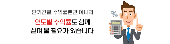 따라서 펀드 관련 정보를 볼 때 기간별 (직전 1개월, 3개월, 6개월, 1년, 2년, 3년) 수익률도 참고해야 하지만 연도별수익률(한 해동안의 수익률)도 함께 살펴봐야 단기수익률 효과의 마법에 빠지지 않고 정확한 투자판단을 할 수 있습니다.