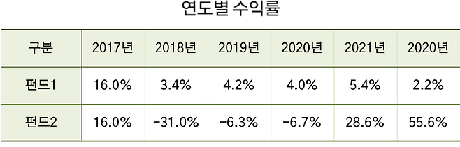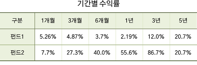 아래의 기간별 수익률표를 보고 2개의 펀드 중 어떤 펀드를 선택할 건지 대답해보세요.