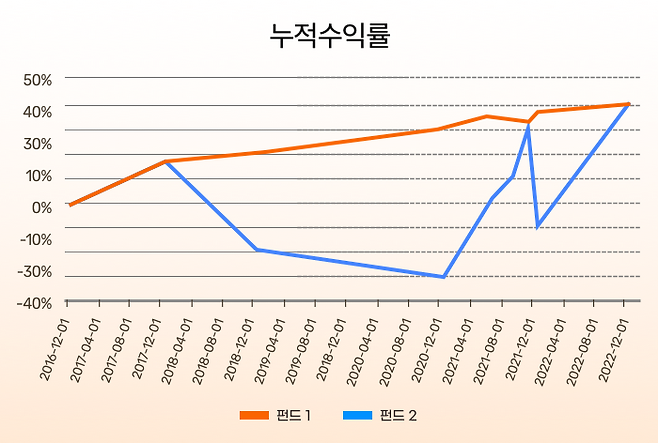 펀드 1의 경우는 안정적으로 꾸준히 증가하는 반면, 펀드 2는 수익률 등락폭이 매우 큰 것을 볼 수 있습니다.