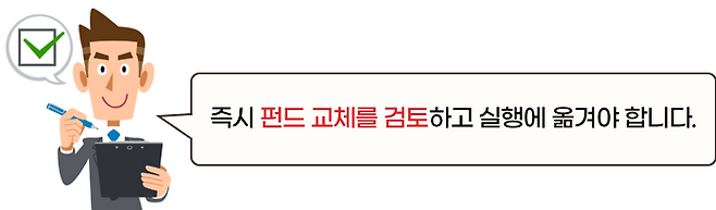 펀드 교체는 펀드 원래 목적대로 운용되지 않는다든지(수익률 및 벤치마크 수익률을 통해서 확인 할 수 있습니다), 펀드 매니저가 바뀌고 난 후 제대로 관리가 안 된다든지, 펀드 규모가 뚜렷한 이유 없이 지속적으로 감소하여 소규모 펀드(설정액 기준 50억 원 미만)로 전락하는 등 여러 상황이 발생했을 때
