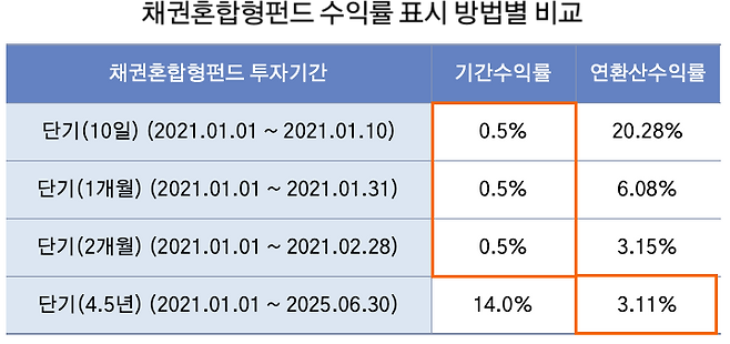 예를 들어 해당 펀드의 단기 기간수익률이 0.5%로 같다고 하더라도 그 기간에 따라 10일인 경우 연환산수익률은 20.28%, 1개월일 경우 6.08%, 2개월일 경우 3.15%로 떨어지게 됩니다.