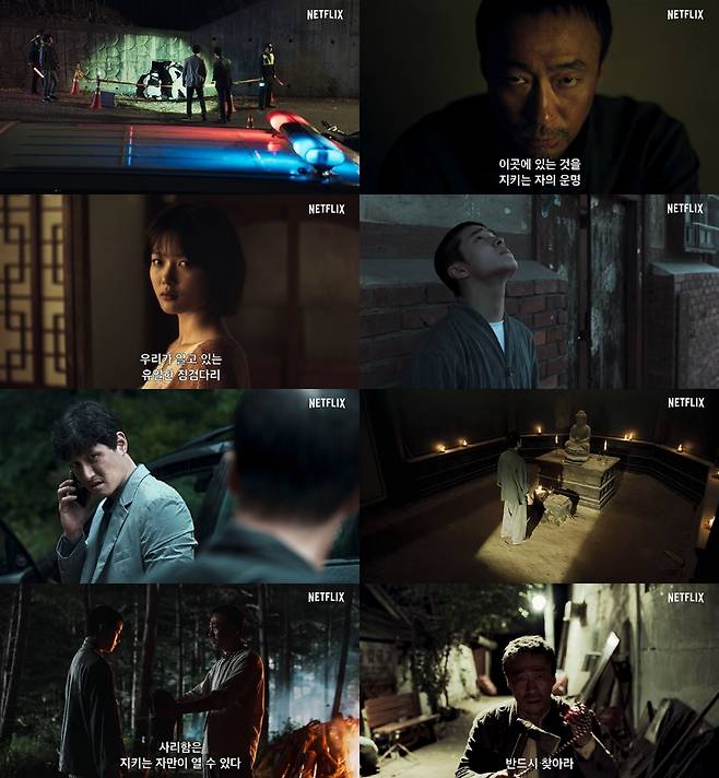 '깨어나서는 안 될 것'의 봉인이 풀리지 않도록 지키는 자, 박진수 역의 이성민, 괴이한 모습으로 발견되는 7구의 괴시체를 수사하는 강력계 형사 김호태로 변신한 박해준, 비밀을 가진 소녀 애란 역의 김유정 그리고 박진수와 동행하는 동자승 청석 역의 남다름까지. 각기 다른 시선으로 의문의 사건을 꿰뚫어보는 인물들의 날카로운 표정은 앞으로 어떤 일이 펼쳐질지 궁금증을 더한다.