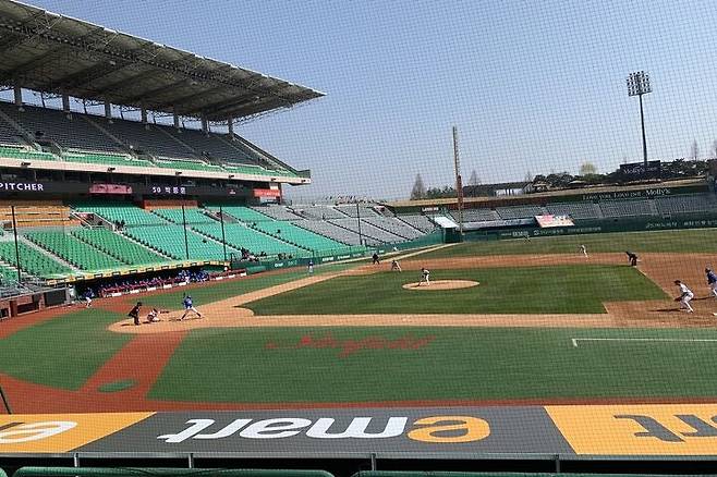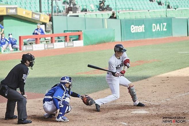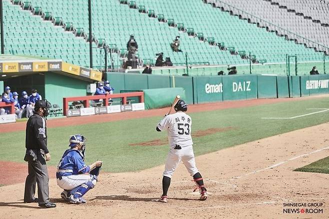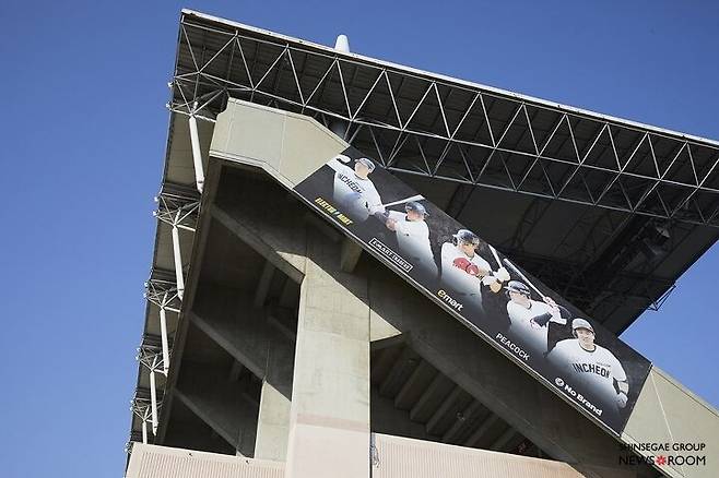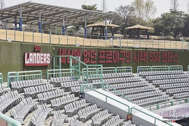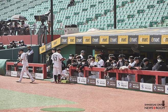 고개를 돌려 경기장을 훑자 신세계적 요소가 시선을 사로잡는다. 양쪽 더그아웃 지붕에는 신세계그룹의 로고를 새겼다. 홈 측에는 이마트, 어웨이 측은 트레이더스다. 베이스라인도 달라졌다. 1루 베이스라인에는 ‘스타필드’, 3루 베이스라인에는 ‘신세계TV쇼핑’의 이름이 각각 보인다.