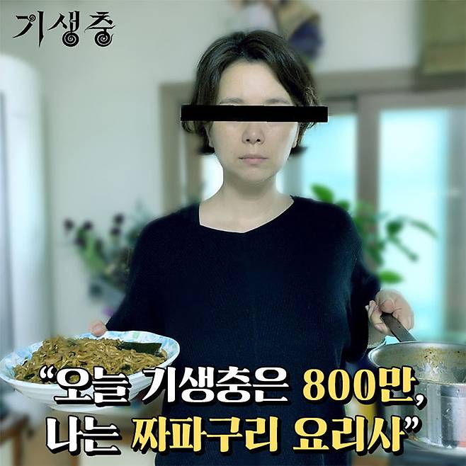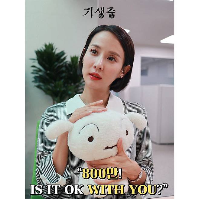 800만 관객 돌파 후에 공개된 감사 메세지는 더욱 더 재치가 빛난다. 대사 패러디와 함께 영화를 본 사람이라면 알아챌 수 있는 캐릭터 패러디까지 더해졌기 때문이다. 인디언 컨셉의 라이언 인형을 들고 있는 송강호는 인디언 모자를 쓰고 다송이(정형준)의 생일 파티에 참석한 기택(송강호)의 모습을 떠오르게 한다. 기택이 운전 기사로 들어와 안정적으로 시험 주행을 하는 기택에게 “코너링이 정말 훌륭하시네요.”라고 칭찬을 건네는 박사장(이선균)의 모습을 패러디하기도 했다. 박소담의 감사 인증샷 또한 영화 속 장면과 대사를 패러디해 보는 순간 자동으로 대사를 흥얼거리게 된다.