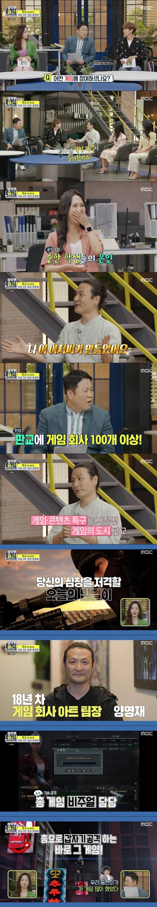 판교에는 게임 회사 100개 이상 있고, 판교가 게임 특구로 지정돼 있다고. 박선영은 “게임 특구로 지정돼 있는 줄 몰랐다”고 놀랐다. 이어 양영재 팀장은 “기습공격 아트 쪽을 담당하고 있다. 캐릭터, 배경, UI, FX, 애니메이션, 눈에 보이는 비주얼적인 면은 다 담당하고 있다고 보면 된다”고 자신이 하는 일을 설명했다.