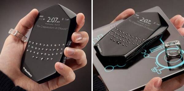 탄탄한 마니아층을 보유하고 있는 블랙베리에서도 콘셉트 스마트폰 엠파시를 선보였다. 우선 디자인이 굉장히 독특한데, 손에 쥔 모습을 보면 왠지 뗀석기를 들고 사냥을 나가는 구석기 시대의 인류가 떠오른다. 또한 전면에는 OLED 터치스크린이 장착됐고, 후면에는 블랙베리의 시그니처인 물리 키보드가 적용됐다.