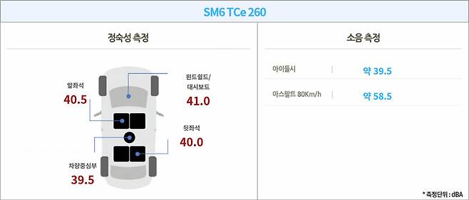 아이들 정숙성을 측정한 결과 39.5dBA을 보였다. 참고로 직접 경쟁하는 쉐보레 말리부 E-터보(1.35T)의 정숙성은 약 38.0dBA 수준. 아이들 엔진 회전수를 확인한 결과 SM6 TCe 260은 약 900rpm, 말리부 1.35T(E-터보)가 약 780rpm을 유지했다. SM6 쪽이 엔진 회전수가 높다 보니 소음에서 소폭 불리한 모습을 보이는 것 같다.