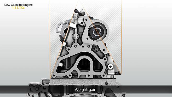 먼저 실린더 헤드를 삼각형 모양에 가깝게 설계했다. 엔진에서 큰 부피를 차지하는 부분이 실린더헤드다. 이것을 최대한 작게 설계했다고 보면 쉽다. 그만큼 엔진의 부피와 무게가 줄어든다. 작고 가벼워진 만큼 소형차부터 중형차까지 다양한 모델에 탑재하는 것이 가능하다. 엔진이 작아지면서 엔진룸 공간을 보다 다양하게 혹은 효율적으로 설계할 수도 있다. 또, 내부 충돌 가능 길이가 늘어나면서 안전성까지 높일 수 있는 이점도 생겼다.