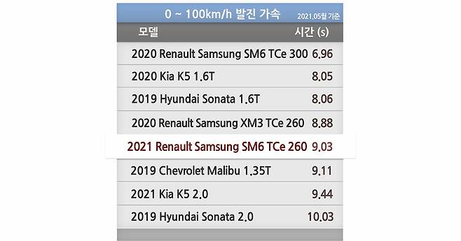 정지 상태에서 시속 100km까지 가속 테스트를 진행한 결과 9.03초가 나왔다. 말리부 E-터보의 9.11초를 앞선 것. 2.0리터 자연흡기 엔진이 탑재된 현대 쏘나타(10.03초)나 기아 K5(9.44초) 보다 빠르니 저 배기량 엔진에 대한 편견은 없어도 되겠다. 특히 26.5kgf·m의 최대토크는 쏘나타 센슈어스의 27.0kgf·m과 거의 유사한 성능을 보여주는 것인데, 배기량 차이를 감안하면 SM6의 1.3리터 터보 엔진의 효율성에 대한 짐작이 갈 것이다.