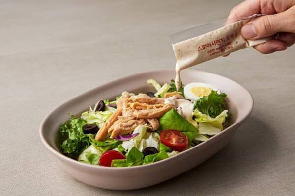 이 제품의 기본 구성은 큐브 모양의 닭가슴살과 슬라이스 아몬드, 양상추, 적양배추, 작은 포크가 들어있다. 드레싱은 고소하고 달달한 맛이 일품인 흑임자 드레싱이다. 드레싱은 묽은 오리엔탈이나 발사믹 소스와는 다르게 마요네즈처럼 꾸덕꾸덕한 편이다. 닭가슴살은 퍽퍽하지 않아서 드레싱과 야채와 조화가 맞다. 총 135g에 118kcal이며, 달달한 소스에 비해 당류가 적은 편이라서 다이어트하는 사람들도 맛있게 즐길 수 있는 샐러드다.