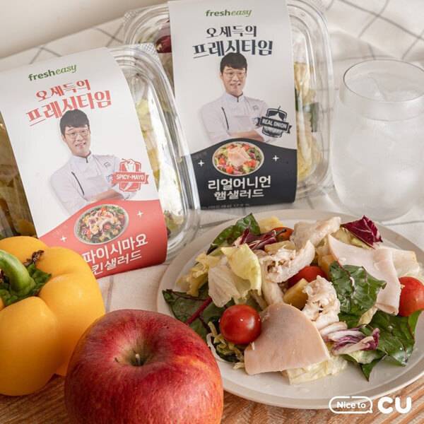 스파이시마요 치킨샐러드 또한 셰프 오세득과 함께하여 출시한 샐러드다. 고소한 마요네즈 소스와 매콤한 핫소스를 섞어 감칠맛을 더했다. 내용물은 고구마, 닭가슴살, 방울토마토, 양상추, 적근대, 라디치오 등으로 이뤄져 있다. 보통 편의점 샐러드 소스는 오리엔탈, 유자드레싱, 키위드레싱 같은 종류가 많은데 마요네즈와 핫소스를 섞은 스파이시 마요 소스는 계속 먹고 싶게 만드는 마성의 소스다. 칼로리는 190kcal로, 다이어터들도 부담 없이 즐길 수 있다.
