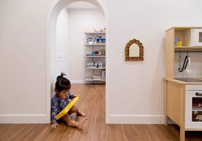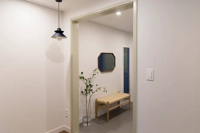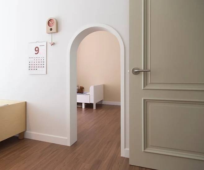 140cm 높이의 아치형 중문으로 바꿨어요. 아이들은 낮은 문을 통과할 때 재미를 느껴요. 그걸 알고 있었기에 이 중문을 아이들에게 처음 소개해 줄 때 남편과 제가 더 들떴던 기억이 나요. 아이들과 이방 저방 우르르 이동할 때도 편하고 각자 자기방에서 뭔가를 할 때에도 커다란 하나의 공간으로 연결되는 느낌이 있어서 혼자라는 기분을 느끼지 않더라고요.