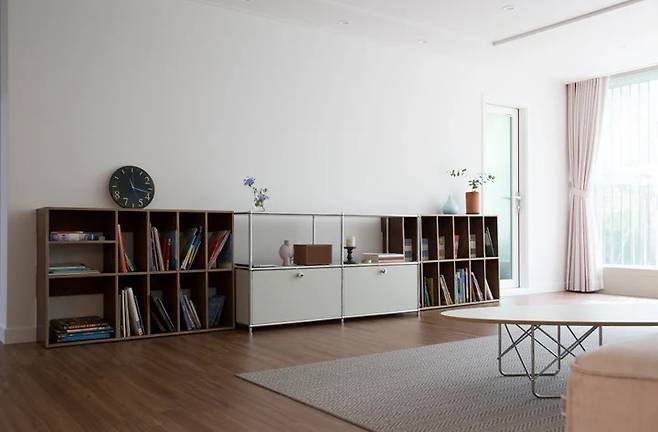 다음으로, TV 없는 우리집 거실이에요. 아이에게 영상 노출을 최소화하고 싶었어요. 영상의 재미를 알기 전에 책 읽는 재미를 먼저 느끼게 하고 싶었거든요. 밥 먹으면서는 마주 보며 웃고 대화하고 싶었는데 정말 그렇게 되었어요. 그러다 보니 TV 를 아예 켜지 않고 지냈고 이 집에서도 그 패턴을 이어가고 싶었기에 TV는 처음부터 구매 목록에 없었어요.