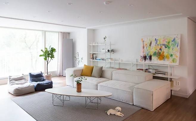 가장 마지막까지 고민했던 가구가 쇼파 옆 공간이었어요. 원래는 이렇게 굉장히 포인트가 될 만한 라운지체어를 넣고 싶었어요. 톤 다운된 거실의 가구와 대비되게 여기에 임팩트를 줄 예정이었거든요. 그러나 어린아이 둘이 함께 거실에 있을 장면을 상상하며 번번히 포기하고 이렇게 애완동물용(^^) 빈백을 한 쌍 구입했답니다.