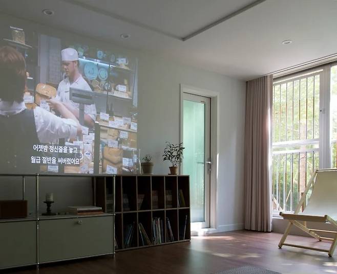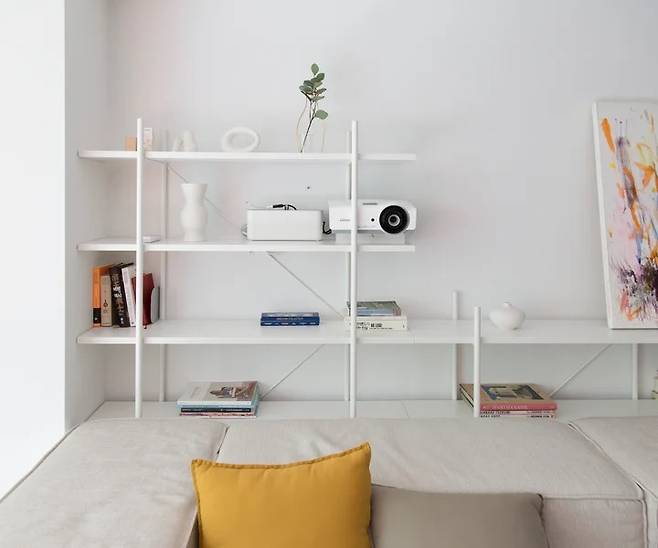 하지만 아이들이 유치원 가기 전에 엘사(겨울왕국) 정도는 알아야 할 것 같아 주말에 틀어주려고 프로젝터를 구비했어요. 오늘의집 노하우 빔프로젝터 편을 탐독한 후, 거실 벽대 벽 거리 5미터 기준에서 거실장 위 벽면 크기에 맞는 사이즈(120인치 이하)로 투사할 수 있는 모델 중에서 골랐어요.