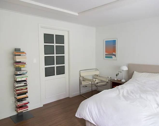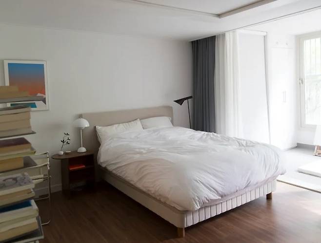 안방이에요. 지금 침대 헤드가 있는 부분에 대부분 붙박이장을 하시더라고요. 저는 드레스룸의 화장대를 없애 붙박이장을 넣는 대신 안방은 조용하고 심플하게 꾸몄어요.