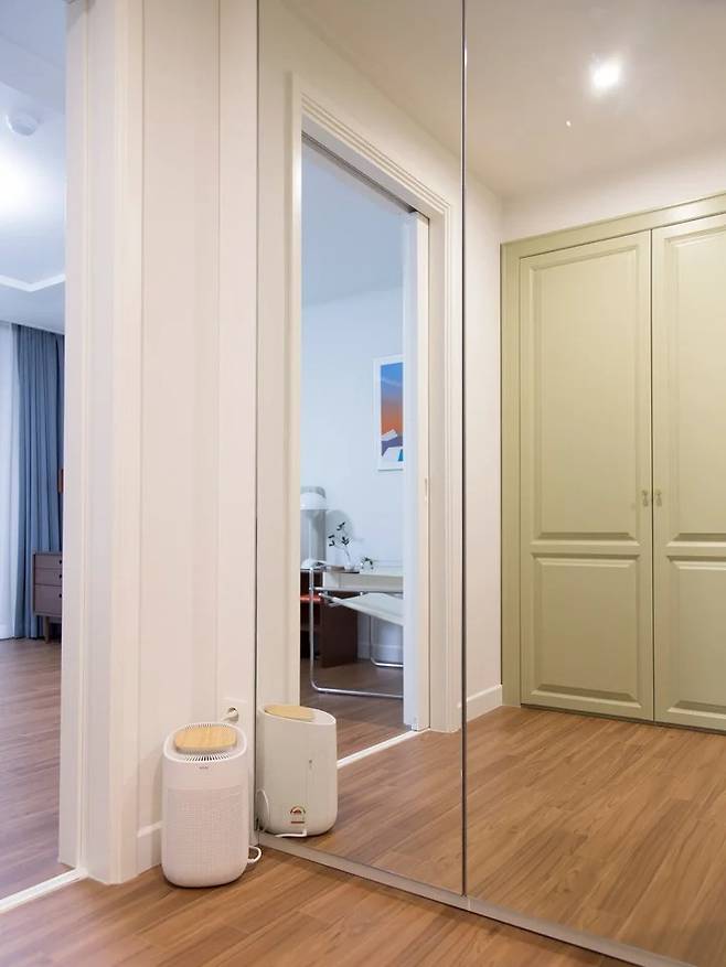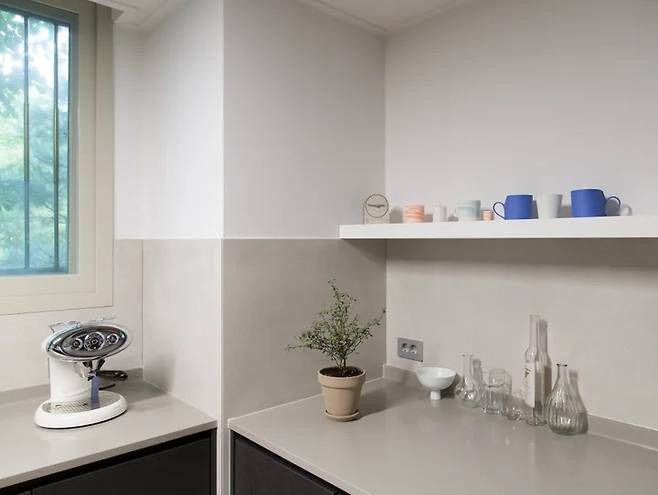 샷시는 처음에 시공된 것이 퀄리티가 괜찮은 이중창이어서 시트지로 색만 바꿨어요. 각 방 문의 도장 색도 이 컬러에 맞춘 것인데, 그린이 한 방울 섞인 라이트 그레이 컬러라 때도 안 타고 집을 한층 모던하게 해주고 있어요.
