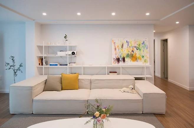 베란다가 확장된 넓은 거실이었기에 일반 소파보다 큰 소파를 넣어야 공간에 어울릴 것 같았어요. 이 모듈 소파의 장점은 팔걸이나 등받이에 아이들이 올라가도 비교적 안전하다는 것, 그리고 나중에 부분적으로 모듈을 추가 구매하면 쿠션이 꺼진 부분만 교체할 수도, 또 배열을 바꿀 수도 있다는 것이에요.