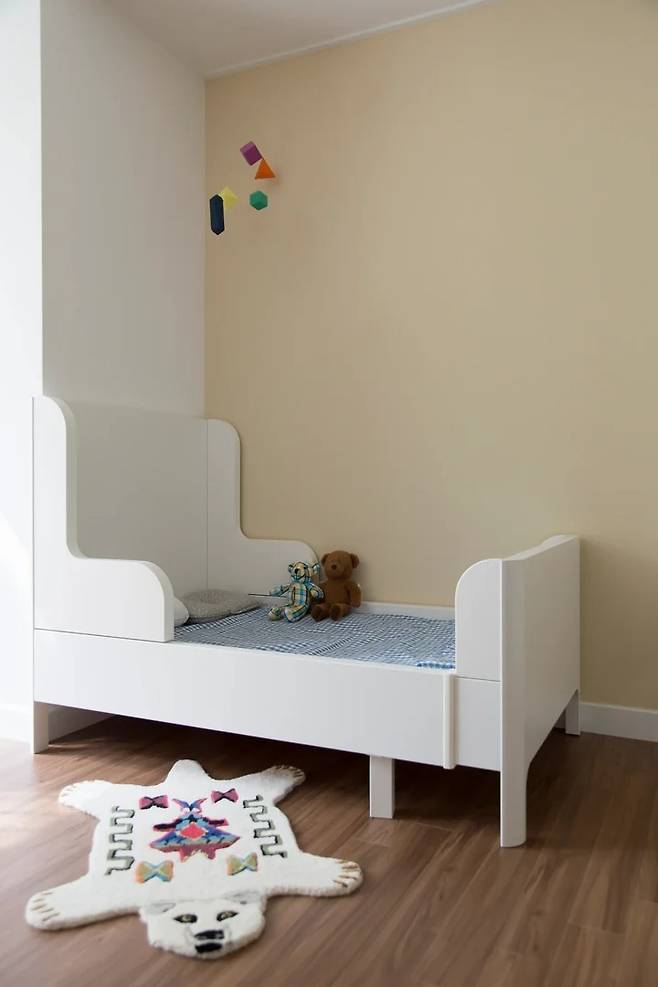 딸아이의 방은 조금 더 아기자기하게 꾸며줬어요. 포인트 벽지도 노랑으로, 가구는 더 아담해요. 처음에 이사 와서 재울 때마다 딸아이가 모빌을 가리키며 '엄마 저기 예쁜 거 있지!' 했는데 먼 훗날 우리 둘에게 예쁜 추억이 될 순간이에요.