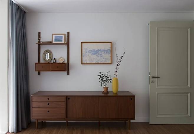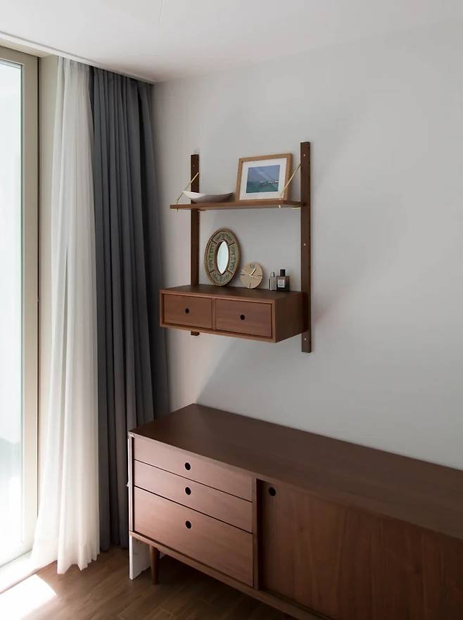 침대 맞은편에 보이는 벽의 모습이에요. 오래전부터 마음에 담아두고 있던 선반을 주문했어요. 벽 선반 서랍 두 개는 우리 부부가 각자 소지품을 넣는 용도로 한 칸씩 사이좋게 나눠쓰고 있어요.