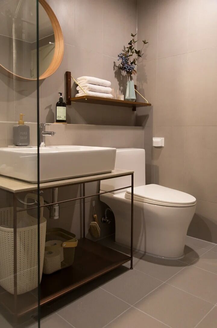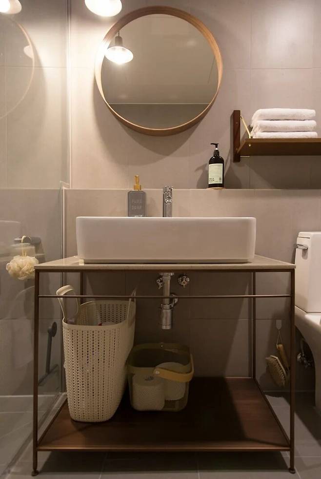 필요 없는 욕조를 철거하고 샤워부스를 달았어요. 상부장 없이 간결한 느낌을 원했기에 하부에 수납공간이 필요했는데, 예전 집 세 군데에서 하부장 내부에 곰팡이 피었던 경험이 있어 오픈된 형태의 프레임을 제작했어요. 하부장 상판을 나무와 인조대리석 사이에서 고민했는데 지금은 만족하고 있어요. 청소와 관리는 제 몫이니까요.
