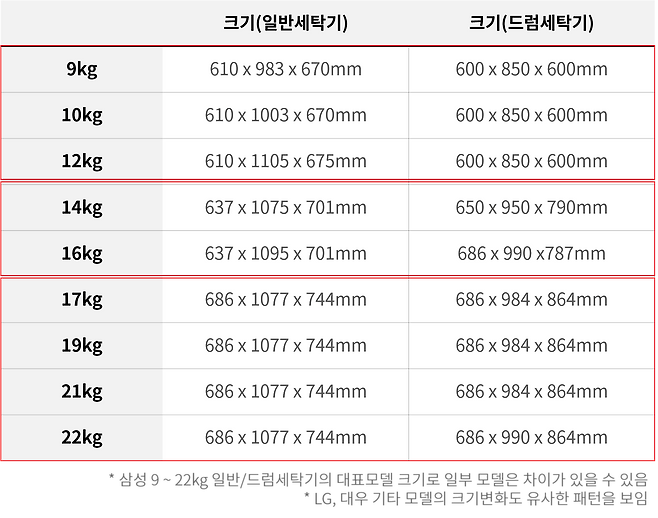 또한, kg이 클수록 세탁조의 크기가 크기는 하지만, 위 표와 같이 일정 구간에서는 모터의 힘만 달라질 뿐 세탁조 크기 차이는 거의 없습니다.