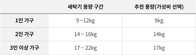 물론, 개인에 따라 세탁주기, 세탁물 양이 천차만별이기 때문에 세탁기 용량은 공기청정기, 에어컨 등과 같이 산술적으로 정해진 기준은 없으므로 상황에 맞게 더 높거나 낮은 용량을 선택할 수 있습니다.
