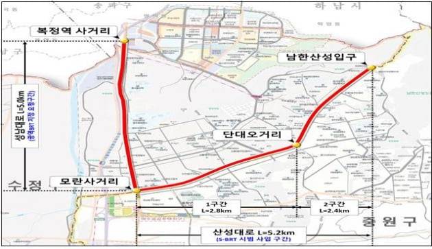성남에는 남한산성 입구∼복정역 사거리까지 총 10.2㎞ 구간에 S-BRT가 구축된다. 주요 경유지는 남한산성∼단대 오거리∼모란역 사거리∼복정역 사거리로 이 중 단대오거리∼모란역 사거리(2.8㎞)를 우선 공사할 계획이다. 올해부터 개발 계획 수립 등 절차를 거쳐 2025년 개통을 목표로 추진된다.