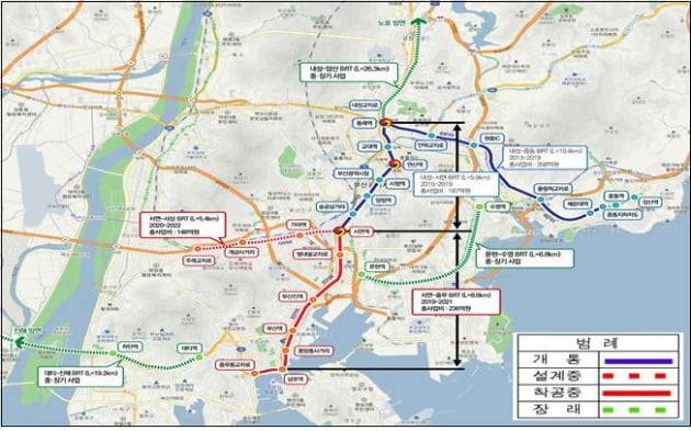 부산시는 2019년 개통한 기존 BRT(서면∼내성, 내성∼중동)와 연계해 서면∼사상, 서면∼충무 2개 BRT 사업을 추진하고 있다. 특히 부산에서는 BRT 개통으로 버스 통행시간이 단축되는 등 BRT 개통에 대한 만족감이 높은 것으로 나타났다. 난해 서면∼내성, 내성∼중동 등 16.3㎞ 구간의 BRT 개통으로 버스의 평균 통행시간은 개통 전보다 19%가량 단축됐으며, 통행속도는 평균 23%가량 빨라졌다고 대광위는 설명했다.