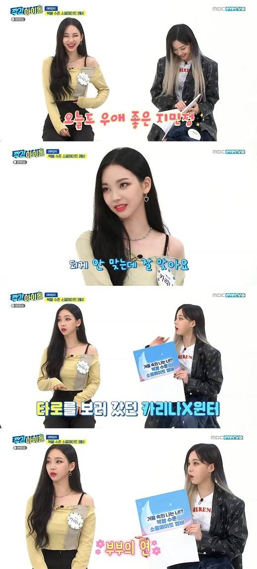 카리나의 소울메이트는 윈터라고. 카리나는 "되게 안 맞는데 잘 맞는다. 타로를 보러 갔는데 '부부의 연'이라더라"라고 돌이켜 폭소를 안겼다.