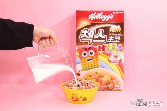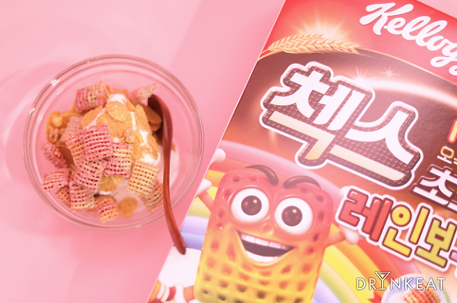 화려한 빛깔이 매력적인 첵스초코 레인보우는 냉동실에서 잠자고 있는 평범한 아이스크림을 단번에 눈과 입이 즐거운 디저트로 탈바꿈시켜요. 바닐라 아이스크림을 두 스쿱, 고소한 그래놀라와 첵스초코 레인보우를 듬뿍 넣어 주면 남녀노소 누구나 즐길 수 있는 디저트가 됩니다. 첵스초코 레인보우의 화이트 크림 코팅이 부드럽고 은은한 달콤함을 선사하고, 곡물의 고소함이 조화를 이루죠.