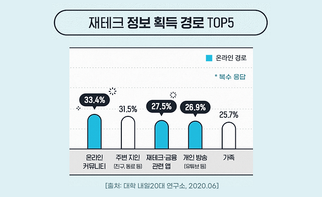 최근 설문조사의 결과로 알 수 있듯이 온라인 경로를 통한 주식 및 재테크 정보 수집이 트렌드를 이루고 있으며 특히 유튜브 등 개인방송을 통한 정보의 획득이 전체의 1/4 이상 될 정도로 영향력이 커졌습니다.