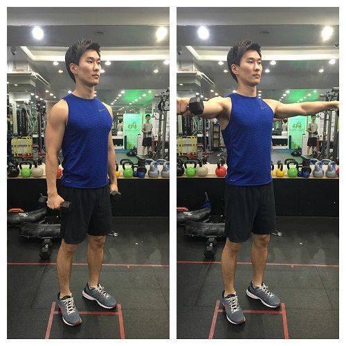 2) 중량을 든 채, 옆으로 들어올린다.