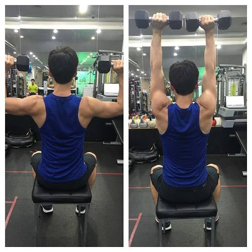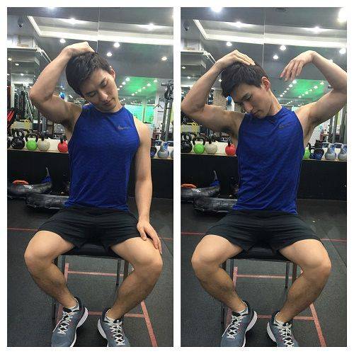 2) 팔꿈치 위치를 유지하며 머리 위로 올린다.