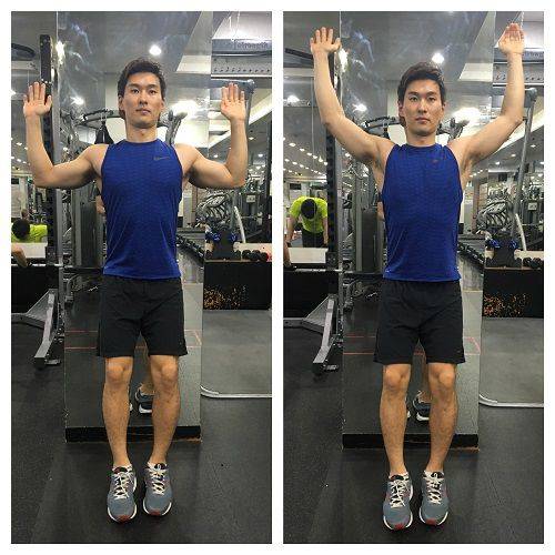 뒤통수, 날개뼈를 벽에 밀착시킨 후, 팔을 천천히 올린다.