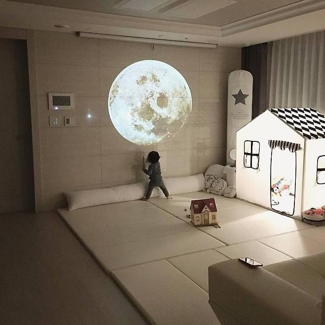 아기가 기어다니기 시작하면서 다칠까봐 거실장과 티비를 치우고 스크린과 빔프로젝터를 설치해서 사용중이에요^^ 낮에는 아기놀이방이고 밤에는 함께 영화도 보는 멀티공간 입니다. 달은 유림이 아빠가 빔프로젝터로 쏜거에요 :)