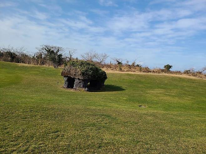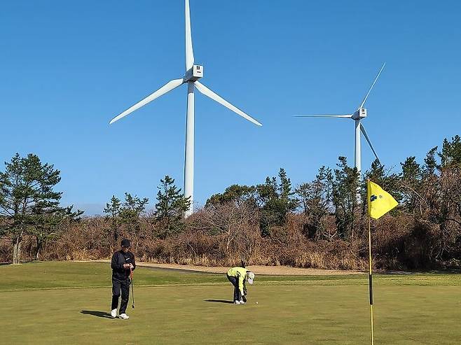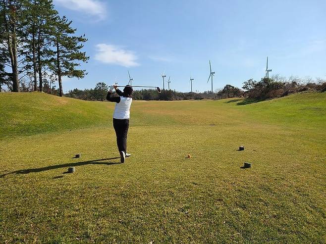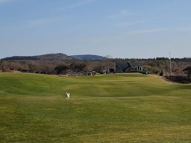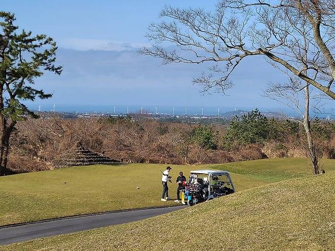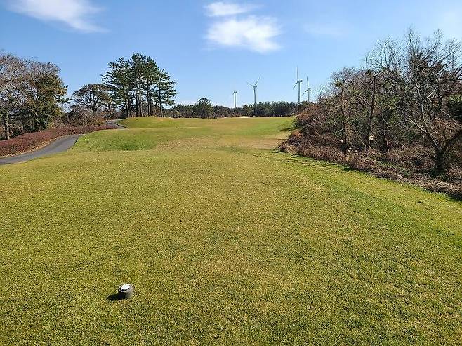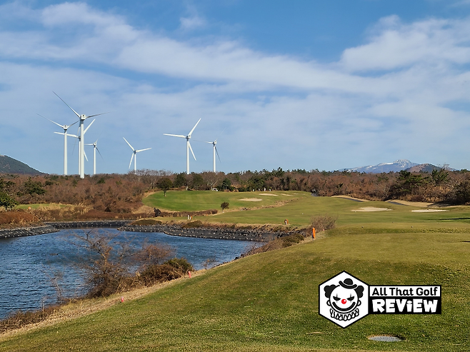 일단 바다는 전혀 보이지 않습니다. 근처에 블랙스톤 코스가 있다고 해서, 거기서도 보인다는 풍력 발전기가 자주 보였습니다. 솔직히, 이거라도 없었으면 약간 밋밋한 코스라고 할 수 있습니다. 강원도에 위치한 버치힐 CC처럼 숲을 깎아낸 코스는 아니지만, 그렇다고 평지만 있는 링크스 코스도 아닙니다. 첫날 2부 티타임 플레이 시 날씨가 맑아서 한라산 정상이 잘 보였습니다.