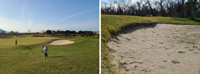 페어웨이 벙커와 그린 사이드 벙커 모두 무난하게 느껴지고 딱히 기억에 남는 부분은 없습니다. 대체로 턱이 무난하게 낮고 중간 사이즈에 살짝 굵은 모래알입니다. 눈과 비가 온 뒤 마른 덕분에 모래가 단단하게 가라앉아서 힘 있게 파내야 잘 나옵니다.