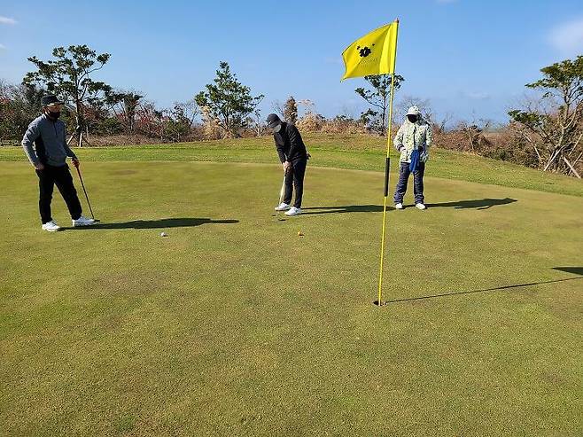제주도에서도 겨울에 눈이 빨리 녹고 그린 상태가 유효하다는 평을 받는다는 라온 CC. 이날은 그린이 유난히 드리게 느껴지던데 공은 잘 받아주었습니다. 퍼팅 시, 역결이 있는지 확인하는 것을 추천합니다. 역결 퍼팅 시 상당히 더 느려지더군요.