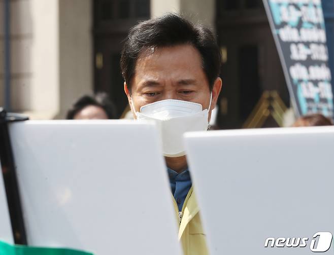 (서울=뉴스1) 송원영 기자 = 오세훈 서울시장이 10일 서울 중구 서울역 앞에 마련된 신종 코로나바이러스 감염증(코로나19) 임시선별검사소에서 코로나19 상황 및 임시선별검사소 운영현황 등을 보고 받고 있다. 2021.4.10/뉴스1