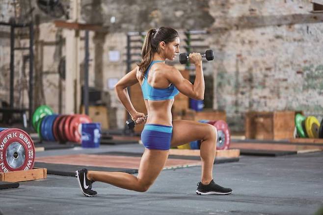 -가벼운 덤벨을 들고 런지 자세를 취하자. 왼쪽 다리는 앞으로, 오른쪽 다리는 뒤로 뻗고 팔은 90도로 굽히자. 오른팔이 앞으로, 왼팔이 뒤로 가야 한다.