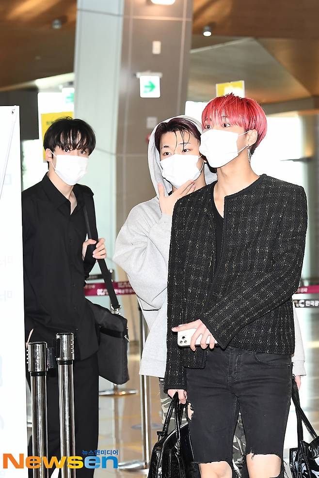 에이티즈(ATEEZ) 멤버 성화, 산, 윤호가 5월 11일 오후 서울 강서구 방화동 김포국제공항 국내선을 제주도로 출발하고 있다.