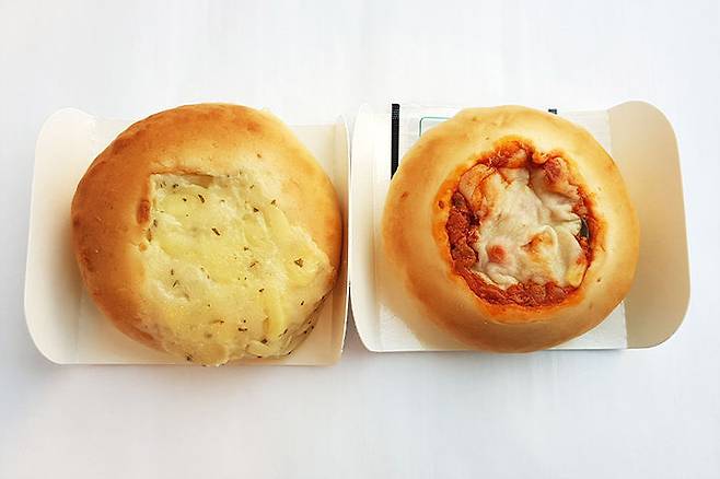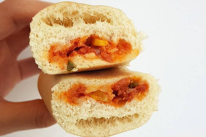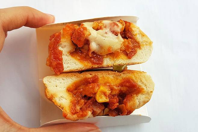 피자빵과 비슷해서 흘러내릴 만큼 토핑이 넘치는 것도 아니라서 제일 깔끔하게 먹을 수 있어요. 빵의 수분감이 적은 편이라 흘러내린다면 빵가루 정도?
