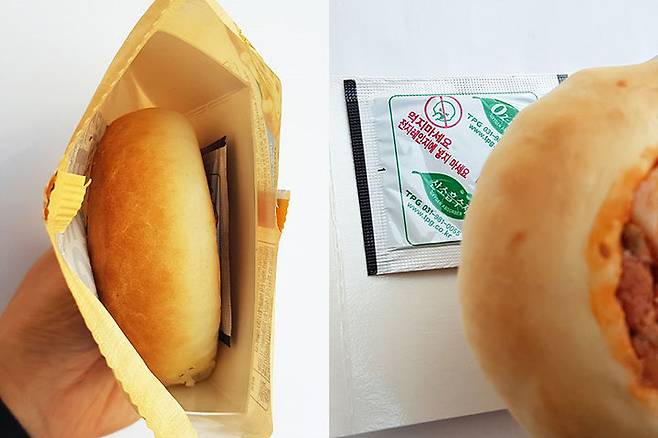 한입피자를 데우고 나서 혹시나 해서 밑바닥을 들어보았는데, 아무것도 없으니 걱정 마세요! 이 피자는 봉지만 벗긴 후 그대로 전자레인지에서 20초만 돌리면 돼요. 전자레인지를 돌리기 전이나 후나 모습의 변화는 없어요. 만져보니 빵 자체에도 수분감이 없는 편이라 살짝 따뜻한 정도에요.